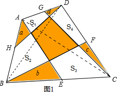 分析 连接BD,由点H、F分别为AB、CD的中点,可得a+d+S1+b+c+S3与S四边形ABCD的关系,S2+S4+S中与S四边形ABCD的关系,同理连接AC可得,a+d+b+c+S2+S4与S四边形ABCD的关系S1+S3+S中与S四边形ABCD的关系,由四式相加,即可求出中间阴影四边形的面积.