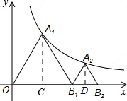 分析 由于△A1OB1等边三角形,作A1C⊥OB1,垂足为C,由等边三角形的性质求出A1C=$\sqrt{3}$OC,设A1的坐标为(m,$\sqrt{3}$m),根据点A1是反比例函数y=$\frac{9\sqrt{3}}{x}$(x>0)的图象上的一点,求出BO的长度;作A2D⊥B1B2,垂足为D.设B1D=a,由于,△A2B1B2为等边三角形,由等边三角形的性质及勾股定理,可用含a的代数式分别表示点A2的横、纵坐标,再代入反比例函数的解析式中,求出a的值,进而得出B2点的坐标.