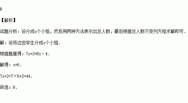(2015秋•莘县期末)班主任老师在七年级(1)班新生分组时发现,若每组7人则多2人,若每组8人则少4人,那么这个班的学生人数是( )人.