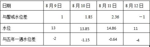 11、在雨季,某河流水位持续上涨并超过警戒水位,下表是某水文站记录的从8月9日到8月12日的水位情况,已知该水文站警戒水位是12米,五年一遇的最高水位是15米,请在表格中填上数据:(单位:米)