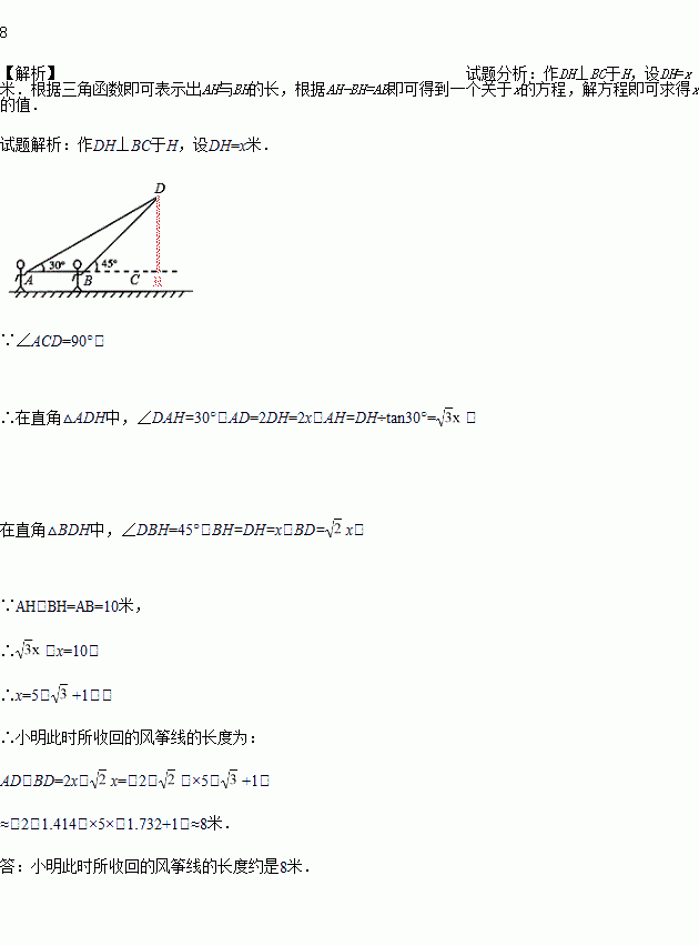 放风筝是大家喜爱的一种运动,星期天的上午小明在市政府广场上放风筝.如图,他在A处不小心让风筝挂在了一棵树梢上,风筝固定在了D处,此时风筝线AD与水平线的夹角为30°,为了便于观察,小明迅速向前边移动,收线到达了离A处10米的B处,此时风筝线BD与水平线的夹角为45°.已知点A,B,C在同一条水平直线上,请你求出小明此时所收回的风筝线的长度是多少米?(风筝线AD,BD均为线段,