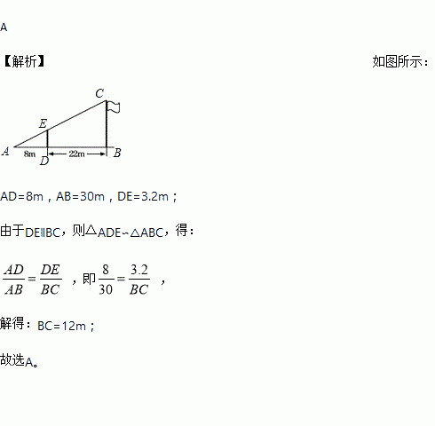 如图,小明用长为3.2m的竹竿做测量工具测量学校旗杆的高度,移动竹竿,使竹竿、旗杆顶端的影子恰好落在地面的同一点.此时,竹竿与这一点相距8m,竹竿与旗杆相距22m,则旗杆的高为( )