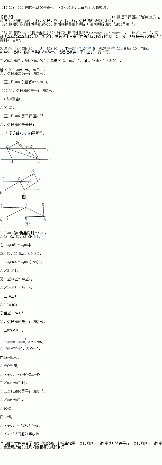已知:直线l1与直线l2平行,且它们之间的距离为2,A、B是直线l1上的两个定点,C、D是直线l2上的两个动点(点C在点D的左侧),AB=CD=5,连接AC、BD、BC,将△ABC沿BC折叠得到△A1BC.