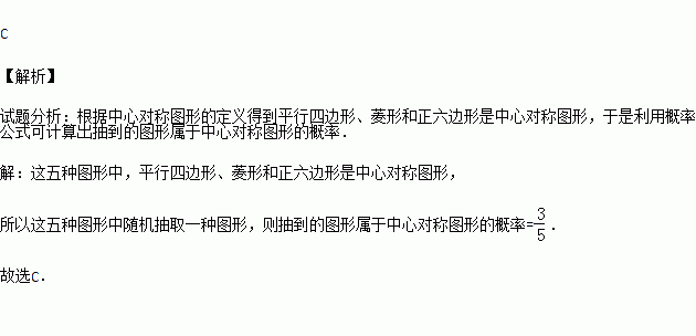 若在“正三角形、平行四边形、菱形、正五边形、正六边形”这五种图形中随机抽取一种图形,则抽到的图形属于中心对称图形的概率是( )