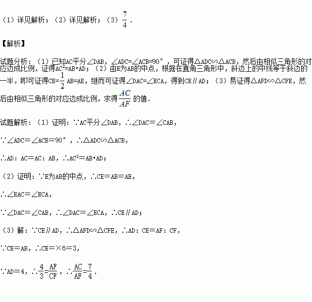 如图,四边形ABCD中,AC平分∠DAB,∠ADC=∠ACB=90°,E为AB的中点,![]()