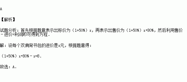 (2015秋•罗山县期末)某商场把一个双肩背书包按进价提高50%标价,然后再按八折出售,这样商场每卖出一个书包就可赢利8元.设每个双肩背书包的进价是x元,根据题意列一元一次方程,正确的是( )
