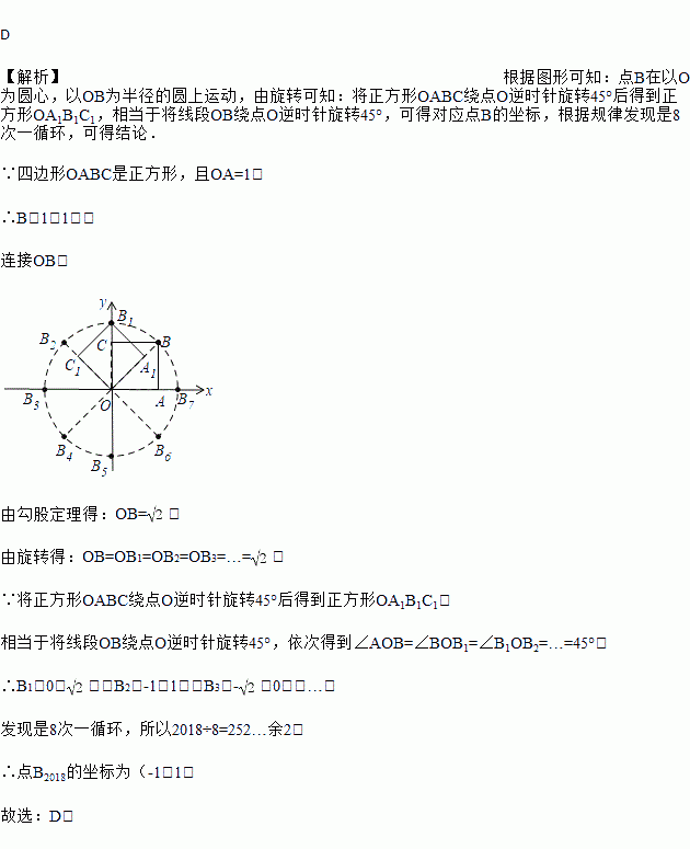 如图,在平面直角坐标系中,将正方形OABC绕点O逆时针旋转45°后得到正方形OA1B1C1,依此方式,绕点O连续旋转2018次得到正方形OA2018B2018C2018,如果点A的坐标为(1,0),那么点B2018的坐标为( )