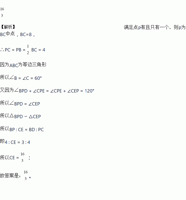 ,PE交边AC于点E,当CE=_______时,满足条件的点P有且只有一个。