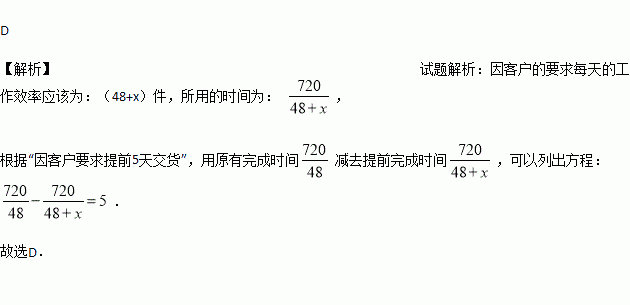 某厂接到加工720件衣服的订单,预计每天做48件,正好按时完成,后因客户要求提前5天交货,设每天应多做x件才能按时交货,则x应满足的方程为( )