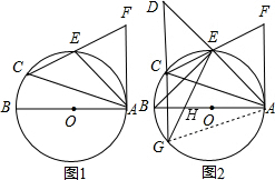 分析 (1)连结BE,如图1,由圆周角定理得到∠AEB=90°,则∠B+∠BAE=90°,而∠B=∠ACE,∠FAE=∠ECA,易得∠FAE+∠BAE=90°,于是根据切线的判定定理可判断AF是⊙0的切线;