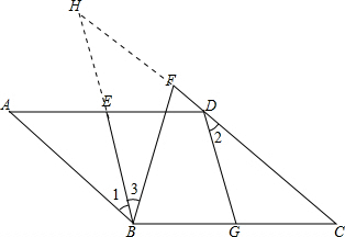 (2)作辅助线,延长DF,BE,相交于点H,证明四边形EBDG为平行四边形,得到BE∥DG,得到∠G=∠2,因为∠3=∠2,得到∠G=∠3,利用等角对等边,得到GF=BF,再证△AEB≌△EDG,得到AB=EG,即可解答.