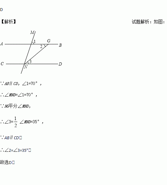 如图,已知AB∥CD,直线MN分别交AB、CD于点M、N,NG平分∠MND,若∠1=70°,则∠2的度数为( )