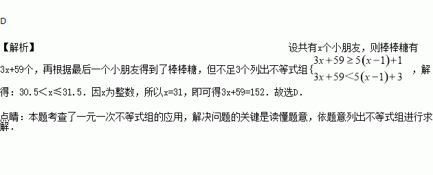 张老师把手中一包棒棒糖准备分给幼儿园小班的小朋友,如果每个小朋友分3个棒棒糖,那么还剩59个;如果前面每一个小朋友分5个棒棒糖,则最后一个小朋友得到了棒棒糖,但不足3个.则张老师手中棒棒糖的个数为