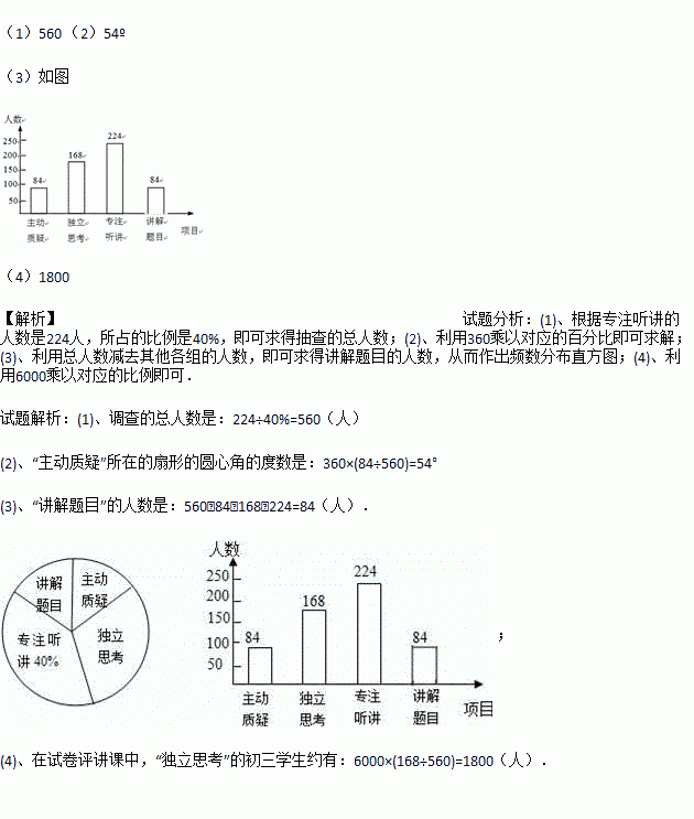 (4)如果全市有6000名初三学生,那么在试卷评讲课中,“独立思考”的初三学生约有多少人?
