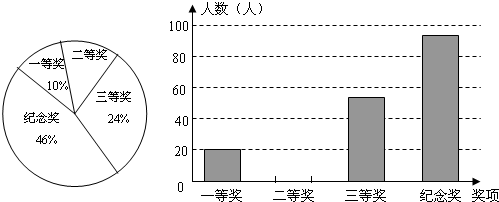 20.浙江省委十三届四次全会提出,要以治污水、防洪水、排涝水、保供水、抓节水“五水共治”的重大决策,某中学为了提高学生参与“五水共治”的积极性举行了“五水共治”知识竞赛,所有参赛学生分别设有一、二、三等奖和纪念奖,获奖情况已汇制成如图所示的两幅不完整的统计图,根据图中所经信息解答下列问题: