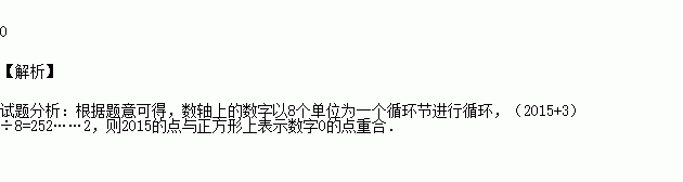 如图,正方形的周长为8个单位.在该正方形的4个顶点处分别标上0、2、4、6,先让正方形上表示数字6的点与数轴上表示-3的点重合,再将数轴按顺时针方向环绕在该正方形上.则数轴上表示2015的点与正方形上表示数字 的点重合.