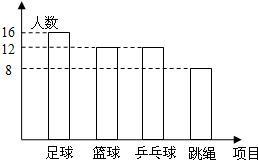 为推进阳光体育活动的开展,某校九年级三班同学组建了足球、篮球、乒乓球、跳绳四个体育活动小组.经调查全班同学全员参与,各活动小组人数分布情况的扇形图和条形图如下:![]()
