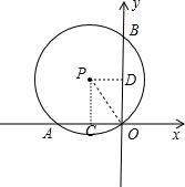 分析:连结OP,作PC⊥OA于A,PD⊥OB于D,则OC=3,OD=4,根据勾股打开计算出OP=5,根据点与圆的位置关系判断点P在⊙P上,再根据垂径定理得到AC=OC=3,BD=OD=4,易得A(-6,0),B(0,8).