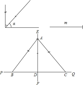 (2)以AF为一边,分别在AF两侧作∠FAB=∠FAC=90°-∠α,分别交直线PQ于点B、C,则△ABC为所求作的等腰三角形.