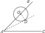 解答 解:设将AC绕点A逆时针旋转到与⊙O相切时切点为D,连接OD,如图所示:则∠ODA=90°,OD=$\frac{1}{2}$OA,∴∠OAD=30°,∴∠CAD=∠BAC-∠OAD=60°-30°=30°,即将AC绕点A逆时针旋转30°°时,AC与⊙O相切;故答案为:30.