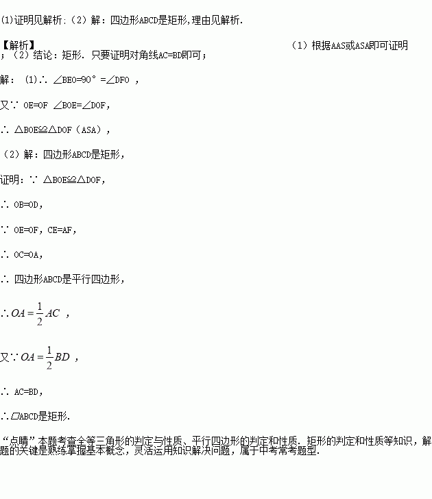 如图,四边形ABCD的对角线AC、BD相交于点O,分别作BE⊥AC于E,DF⊥AC于F,已知OE=OF,CE=AF.