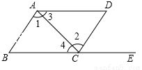 A.∠3=∠4 B.∠1=∠2 C.∠B=∠DCE D.∠D+∠DAB=180°