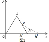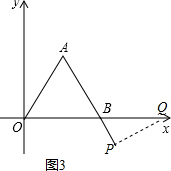 (3)如图2,当点P在线段AB上时,由△ABO是等边三角形,得到∠ABO=60°,推出△PBQ是等腰三角形,根据等腰三角形的性质列方程即可得到结论;当P在射线AB上时,如图3,连接PQ,由△ABO是等边三角形,得到∠PBQ=∠ABO=60°,推出△PQB是直角三角形,由直角三角形的性质列方程即可得到结论.