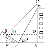分析 过B分别作AE、DE的垂线,设垂足为F、G.分别在Rt△ABF和Rt△ADE中,通过解直角三角形求出BF、AF、DE的长,进而可求出EF即BG的长;在Rt△CBG中,∠CBG=45°,则CG=BG,由此可求出CG的长;根据CD=CG+GE-DE即可求出宣传牌的高度.