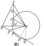 (2)作CH⊥BE于点H,连结CQ,如图1,根据垂径定理得到PH=QH,由半径相等得到CQ=CN=5,由于△CBE是由△CAD旋转得到,利用旋转的性质得到∠CBE=∠CAD=30°,则在Rt△CBH中利用含30度的直角三角形三边的关系得到CH=$\frac{1}{2}$BC=4,然后在Rt△CHQ中利用勾股定理可计算出QH=3,从而得到PQ=2HQ=6;