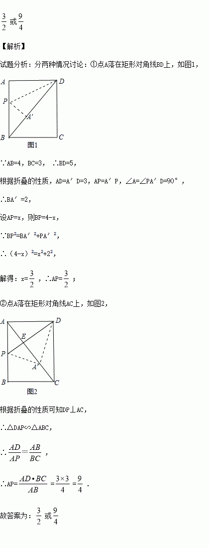 在矩形ABCD中,AB=4, BC=3, 点P在AB上。若将△DAP沿DP折叠,使点A落在矩形对角线上的