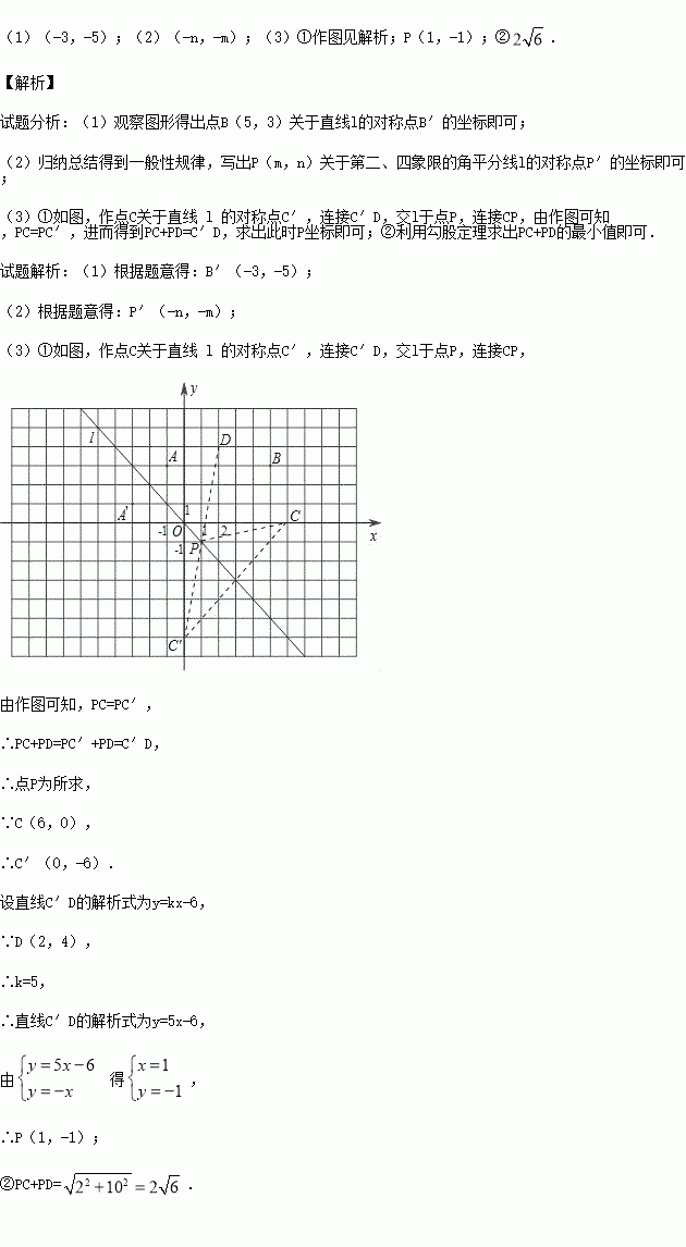 (1)实验与探究:由图观察易知A(-1,3)关于直线l的对称点A′的坐标为(-3,1),请你写出点B(5,3)关于直线l的对称点B′的坐标为 ;