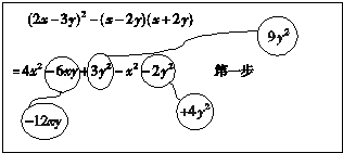 | (2x-3y)2-(x-2y)(x+2y) =4x2-6xy+3y2-x2-2y2 第一步 =3x2-6xy+y2 第二步 |