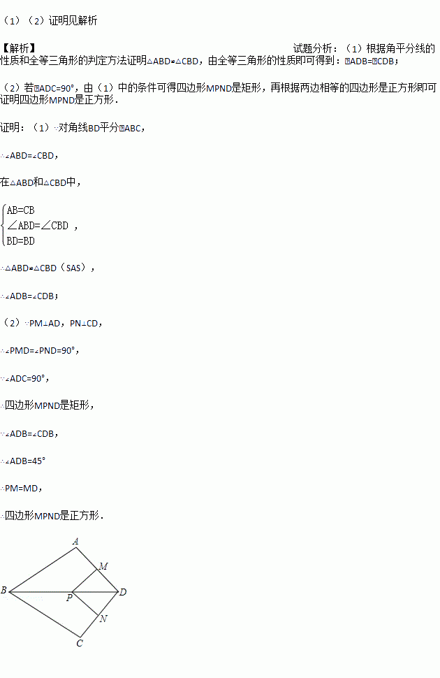 如图,在四边形ABCD中,AB=BC,对角线BD平分∠ABC,P是BD上一点,过点P作PM⊥AD,PN⊥CD,垂足分别为M、N.