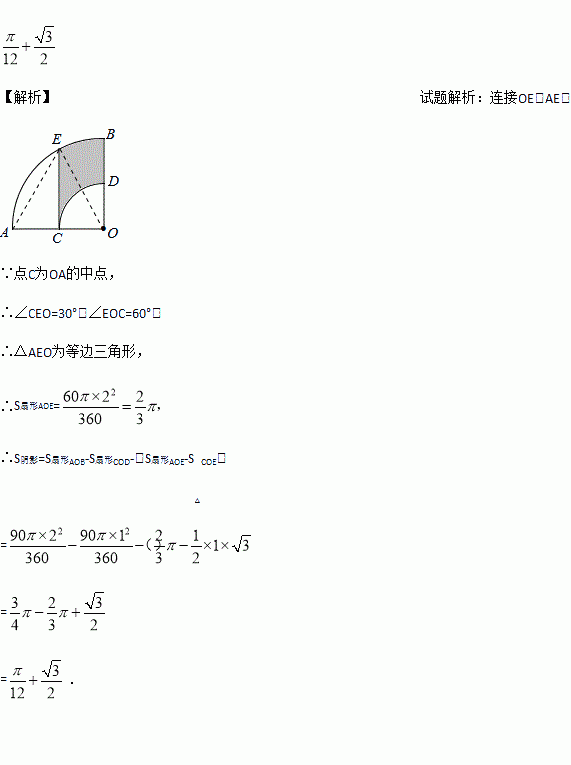 如图,在扇形AOB中,∠AOB=90°,点C为OA的中点,CE⊥OA交弧AB于点E,以点O为圆心,OC为半径作弧CD交OB于点D,若OA=2,则阴影部分的面积为______.