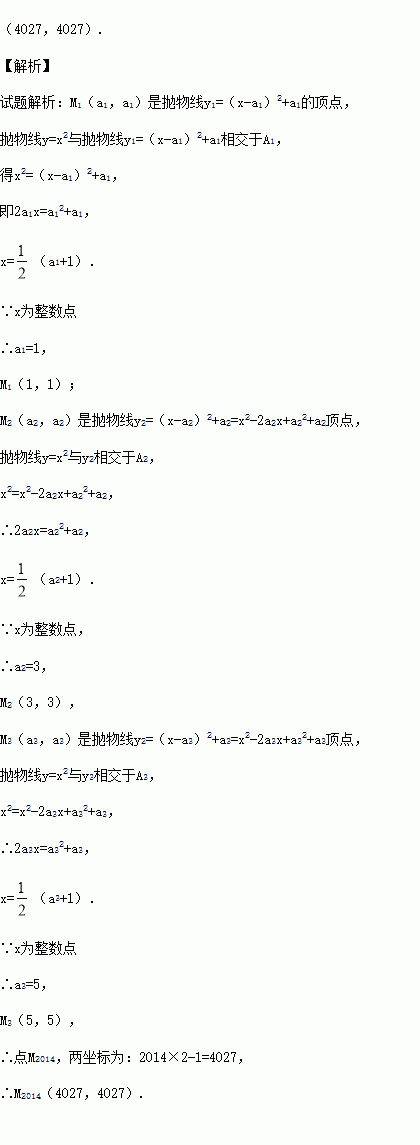 如图,抛物线y=x2在第一象限内经过的整数点(横坐标、纵坐标都为整数的点)依次为A1,A2,A3…An,….将抛物线y=x2沿直线L:y=x向上平移,得一系列抛物线,且满足下列条件:①抛物线的顶点M1,M2,M3,…Mn,…都在直线L:y=x上;②抛物线依次经过点A1,A2,A3…An,….则顶点M2014的坐标为_______.