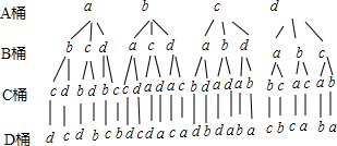解答 解:可回收垃圾、厨余垃圾、有害垃圾和其他垃圾对应的垃圾筒分别用A,B,C,D表示,垃圾分别用a,b,c,d表示.共有24种情况,四袋垃圾都放对位置的有1种情况,则P(四袋垃圾都放对位置)=$\frac{1}{24}$.