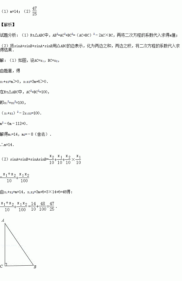 (1999•昆明)在△ABC,∠C=90°,斜边AB=10,直角边AC、BC的长是关于x的方程x2﹣mx+3m+6=0的两个实数根.