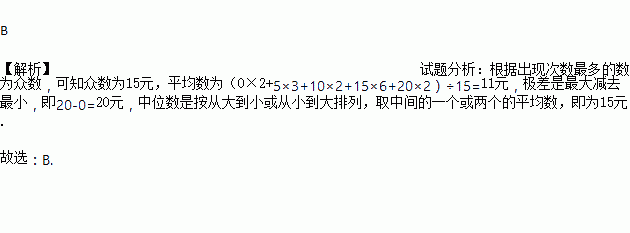 A. 众数是20元 B. 平均数是11元 C. 极差是15元 D. 中位数是10元