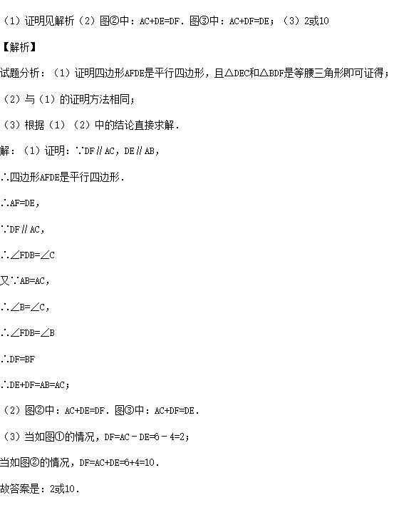 在△ABC中,AB=AC,点D在边BC所在的直线上,过点D作DF∥AC交直线AB于点F,DE∥AB交直线AC于点E.