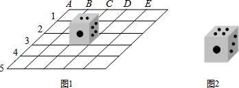 在有五行五列的方形棋盘上,把骰子沿某条棱在棋盘上向它所在格的左、右、前、后格翻动,开始时骰子在3C处(3C表示“3”行与“C”列的交汇处,如图1),将骰子从3C处翻动一次到3B处,骰子的状态如图2所示,如果从3C处开始翻两次,使有四点的一面朝上,那么,骰子所在的位置应是
