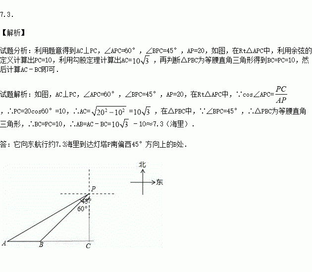 一艘轮船位于灯塔P南偏西60°方向,距离灯塔20海里的A处,它向东航行多少海里到达灯塔P南偏西45°方向上的B处(参考数据: