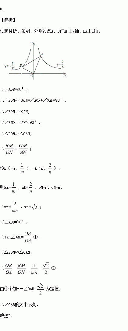 的图象交于B、A两点,则∠OAB的大小的变化趋势为( )