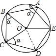 分析:连接OD,要求α的度数,只需求出∠AOB的度数,根据已知条件,易证∠AOB=∠BOC=∠COD=∠DOE,所以可以求出α的度数.