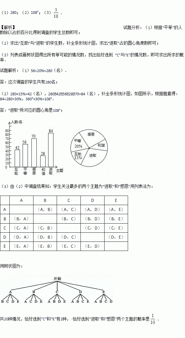 (3)如果要在这5个主题中任选两个进行调查,根据(2)中调查结果,用树状图或列表法, 求恰好选到学生关注最多的两个主题的概率(将互助、平等、感恩、和谐、进取依次记为A、B、C、D、E).