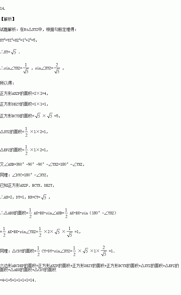 如图,分别以Rt△XYZ的直角边和斜边为边向形外作正方形AXZF、BCYX、DEZY,若直角边YZ=1,XZ=2,则六边形ABCDEF的面积为 .