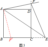 如图3,在正方形ABCD中,已知∠EAF=45°,角的两边AE、AF分别与BC、CD的延长线相交于点E、F,连接EF.写出EF、BE、DF之间的关系式,并证明你的结论.