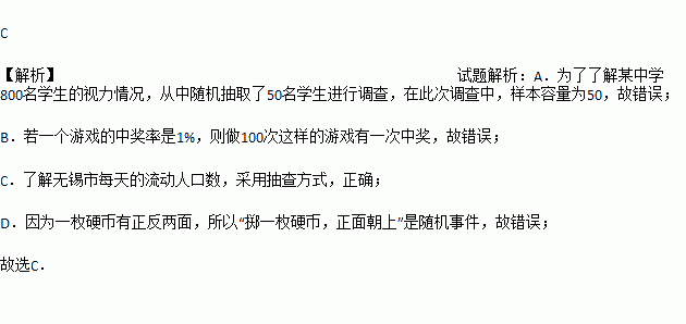 A. 为了了解某中学800名学生的视力情况,从中随机抽取了50名学生进行调查,在此次调查中,样本容量为50名学生的视力