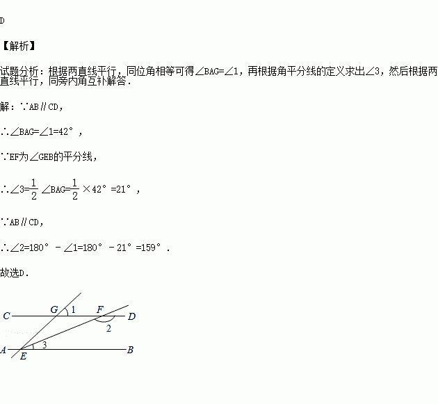 如图,已知直线AB∥CD,∠GEB的平分线EF交CD于点F,∠1=42°,则∠2等于( )