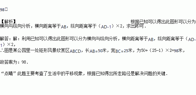 如图是某公园里一处矩形风景欣赏区ABCD,长AB=50米,宽BC=25米,为方便游人观赏,公园特意修建了如图所示的小路(图中非阴影部分),小路的宽均为1米,那小明沿着小路的中间,从出口A到出口B所走的路线(图中虚线)长为___________