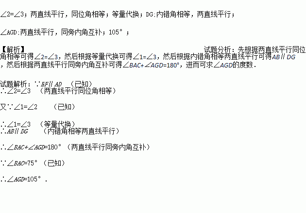 如图:EF∥AD,∠1=∠2,∠BAC=75°.将求∠AGD的过程填写完整.